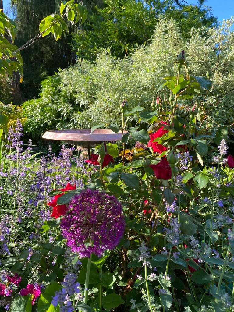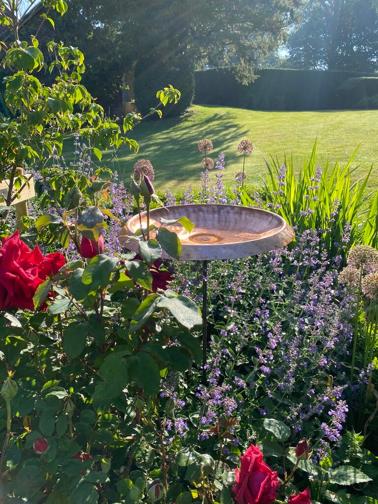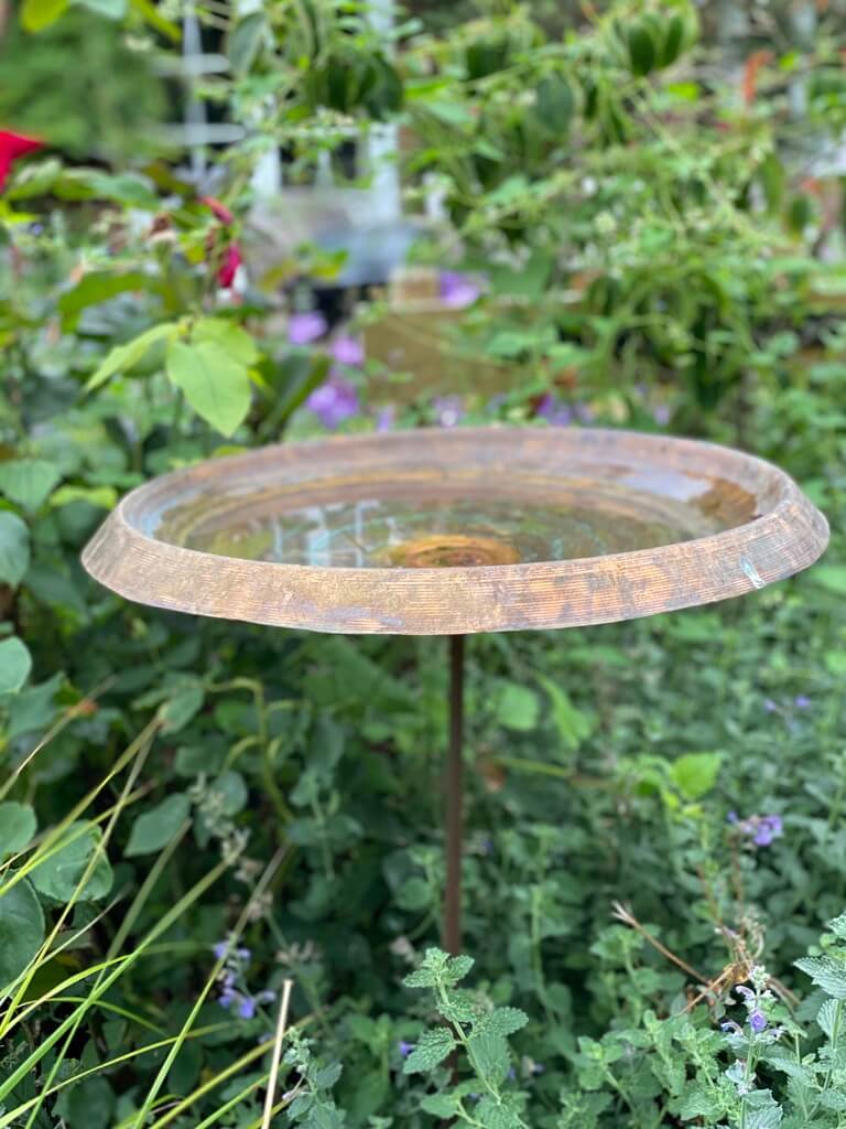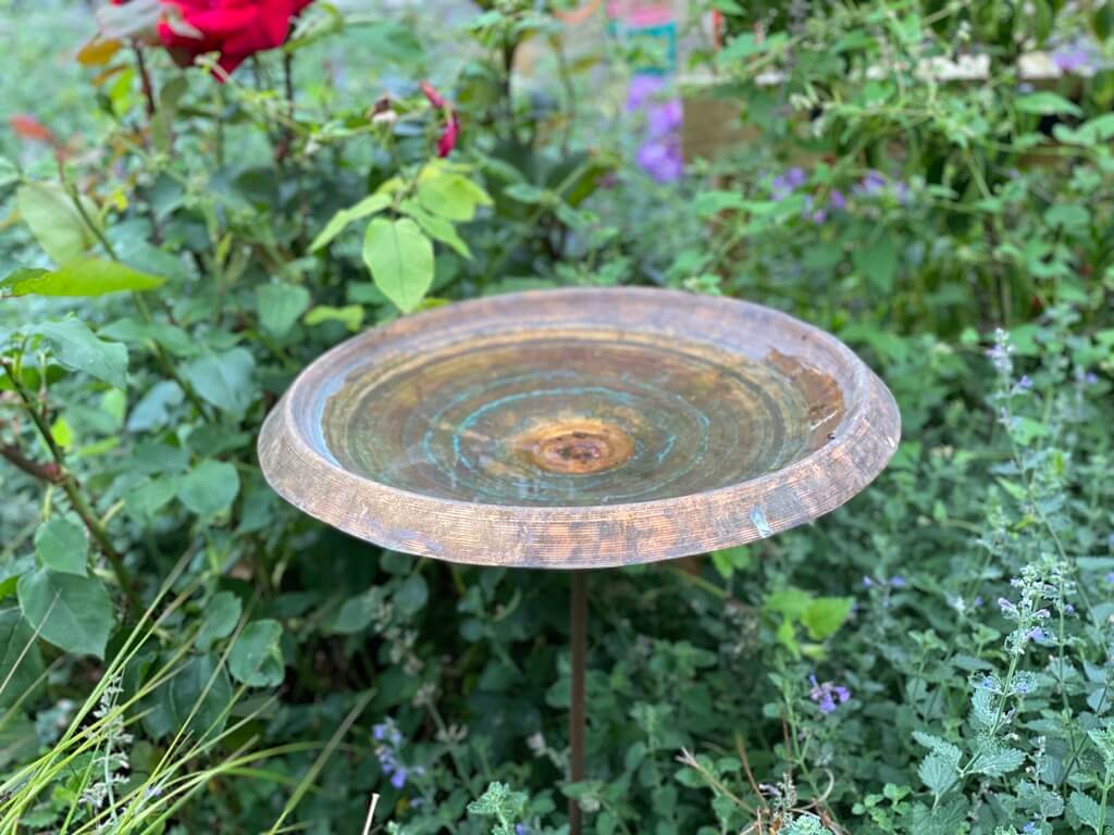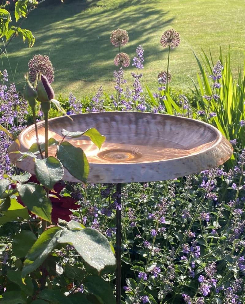 TORI is a stylish bird bath made from a reclaimed copper boiler bottom with a chamfered edge. Striking in profile and designed to be inserted into flower beds or lawns or hedges or anywhere soft. It not only looks elegant it is a great place for birds to bathe and drink.
